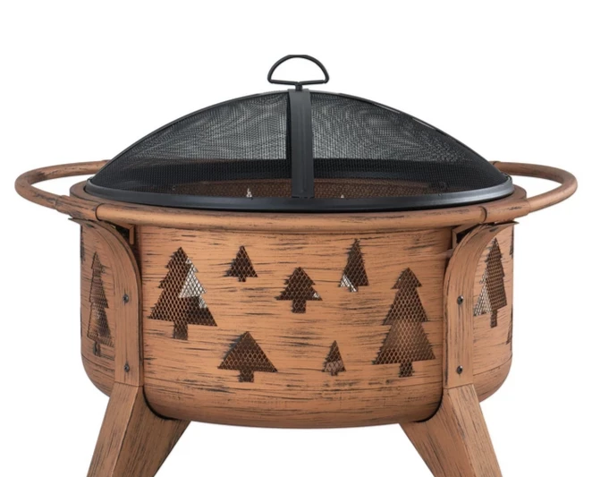 Enjoy your favorite beverage while swapping stories under the stars around this wood-burning firepit , the world’s leading ready-to-assemble outdoor structure maker. Transform your backyard into a relaxation destination. The 30″ rust-resistant powder-coated steel firepit comes with a fire poker and mesh screen cover to limit sparks. The tree design adds visual interest to the piece even when it’s not in use.