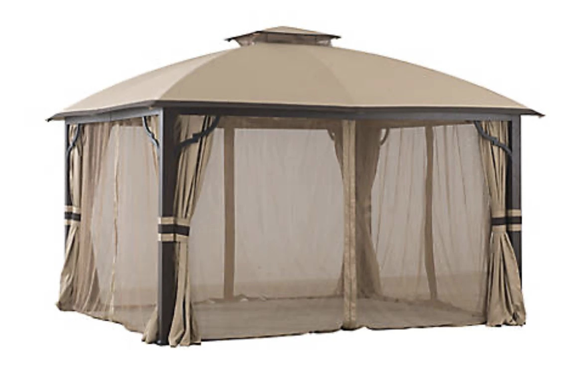 - Includes fabric top gazebo, mosquito netting, and privacy curtain