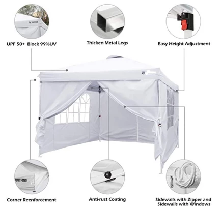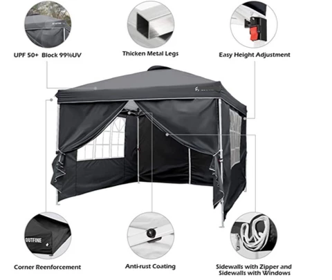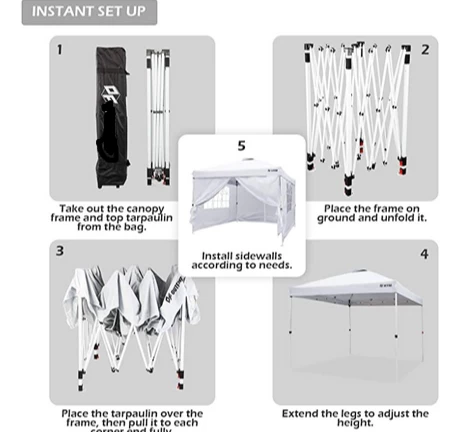 - EASY TO ASSEMBLE – Only two people are required to easily complete the entire assembly in a few minutes. Take out the canopy frame and top tarpaulin from the bag, place it on ground and unfold it, place the tarpaulin over the frame, then pull it to each corner end fully and extend the legs and it is done. Three different height settings allow you to pick the height which you want, 73inch, 77inch and 81inch. Thumb latch lock system easy to lock and release.