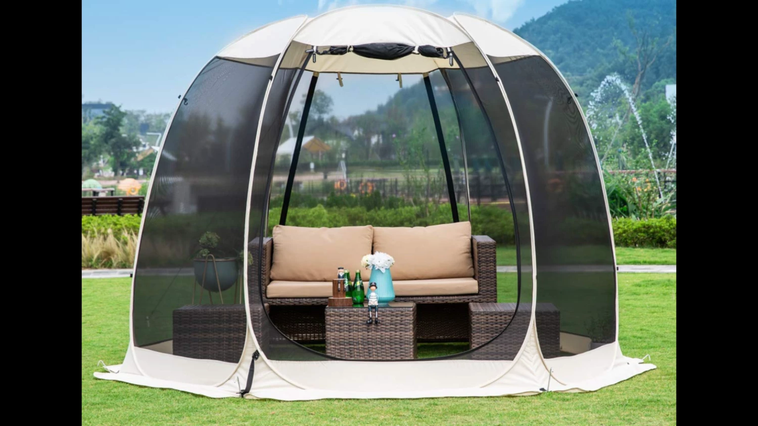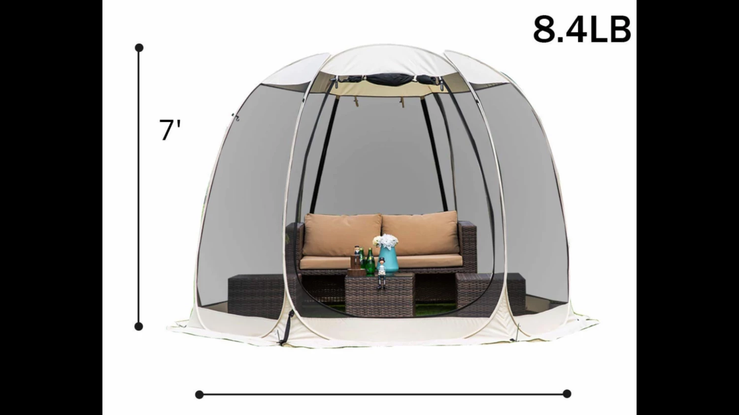 I bought this for use with our RV to protect us from the bugs. It goes up superfast! Sized right for 2 of us and our comfortable camping chairs. Folds down flat when not in use and fits snugly back in the carry bag. I highly recommend for camping or backyard use.