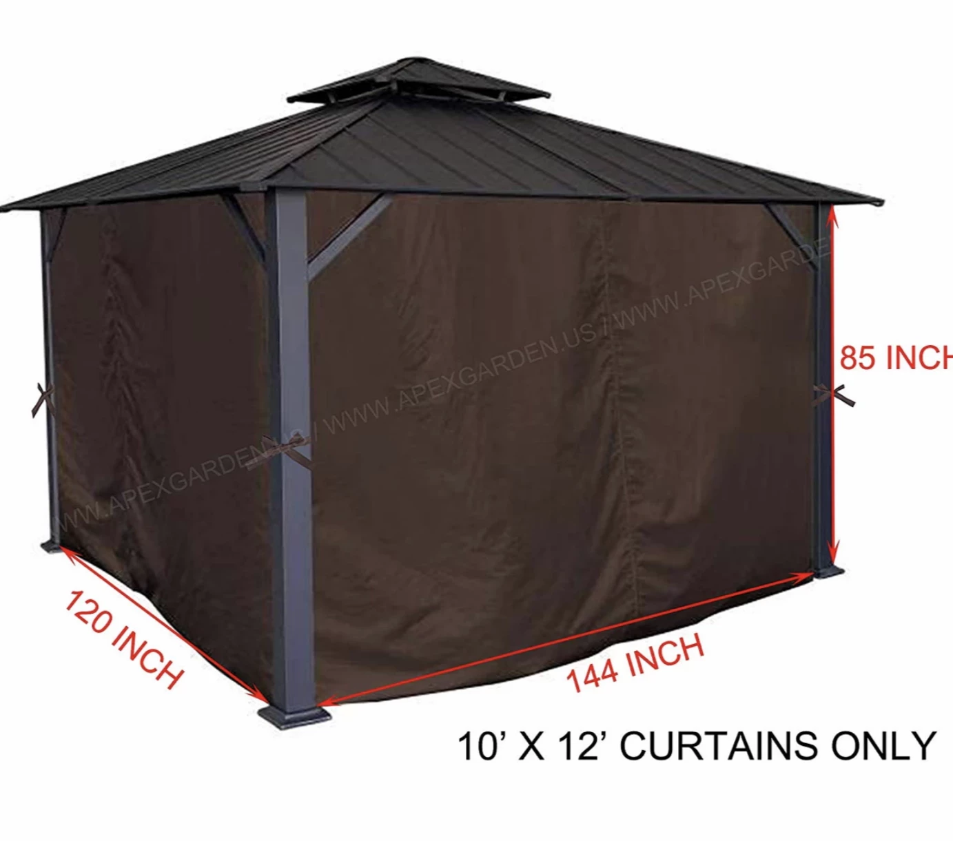 - Dimensions: 144″ (L) x 120″ (W) x 85″ (H). 85″ (H) Full-length provide more privacy room and protection from sun and winds. Please do the measurements of your gazebo and make sure that our product will fit it.